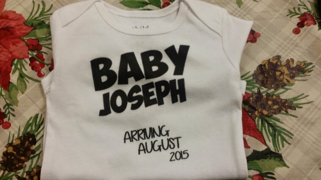 December 24th was my mom's side of the family. We decided to let my uncle announce it since I had no grandparents left on this side of the family, he just didn't know he was going to! We put our onesie that we had printed in a box that said to Jeff, from Santa. When he opened it, he had sort of a confused look on his face. My cousin Britni got it right away and said aww yay! When everyone was still confused she went on to say, "Lydia's pregnant!........Right?" Once it was confirmed by Chris and I by a nod of the head, my uncle could breathe again. He thought it was his wife's way of telling him that they were having their 3rd. With a sigh of relief, he slid the box to me and said, "Congratulations!"